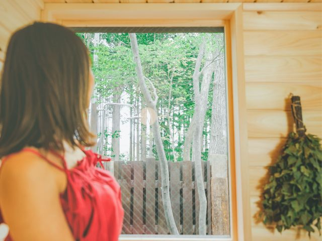 サウナの大きな窓から那須の雄大な森が楽しめます!