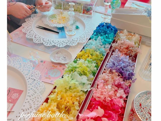 お花に囲まれながらのハーバリウム体験。OnlyOneが作れる!たくさんの本物お花のプリザーブドフラワーを使用します。
