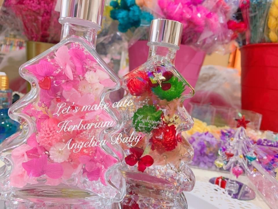 クリスマスバージョンも作れます!大人気におしゃれで可愛いボトル。カラフルな本物のお花を使用して作ります