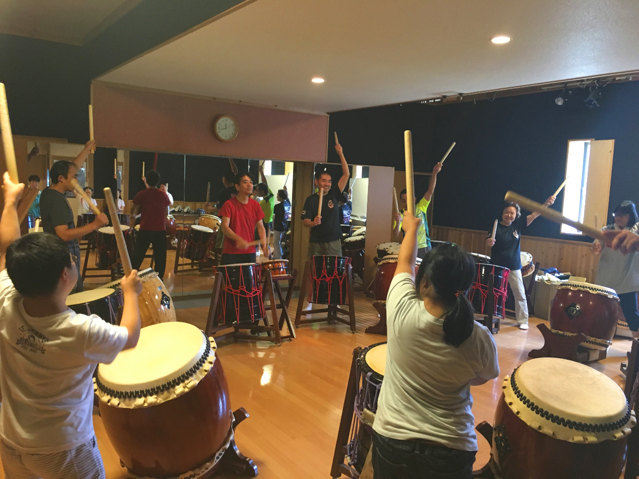 A和太鼓(バチの扱い・立ち姿勢から基本の打ち方を習得体験。その後簡単なお囃子を打てるように進めてゆきます)
