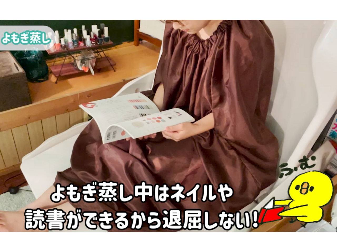 裸に専用ガウンを着て、皮膚や吸収の良い膣粘膜から蒸気を取り込み、身体を末端まで温めます。