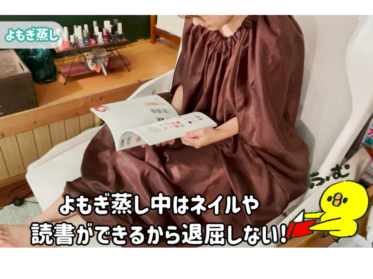 裸に専用ガウンを着て、皮膚や吸収の良い膣粘膜から蒸気を取り込み、身体を末端まで温めます。