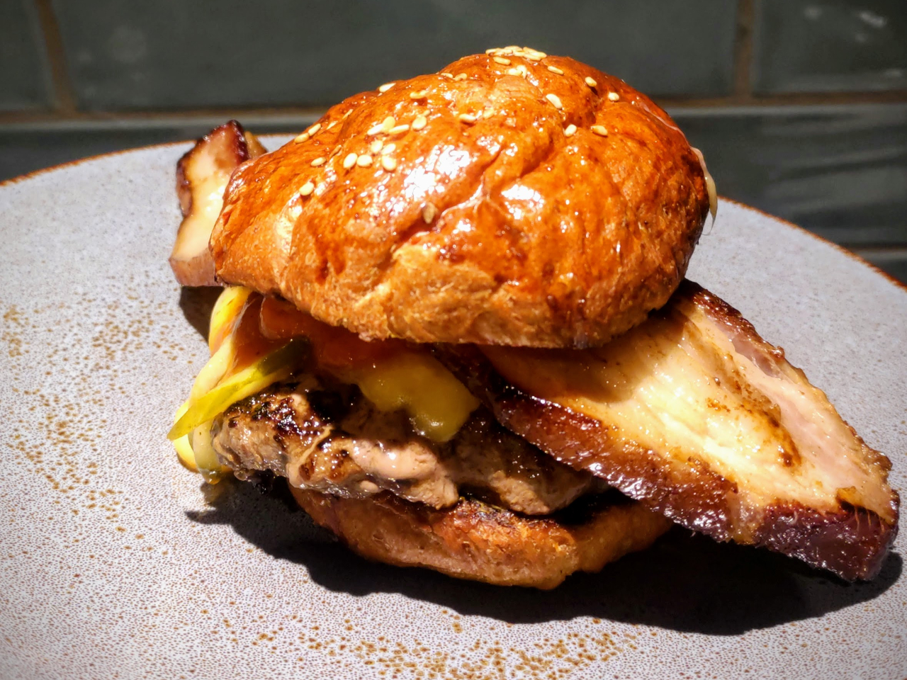 BBQセット :店舗で作ったパン、USビーフ100%パティ、ベーコンを炭火で焼くベーコンバーガー