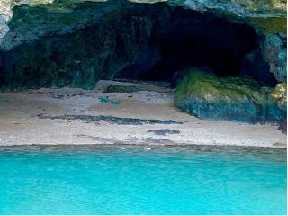 洞窟の目の前には青く透き通った海と、皆大好き!可愛いアオウミガメが皆さんを待っています♪シュノーケリング・ボートシュノーケル