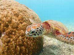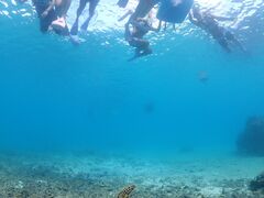 初めてのシュノーケリング。ガイドさんから説明を受けて海に入りましたが、急に緊張してしまいウミガメのいるスポットまでうまく泳げませんでした。すぐにガイドさんが気がつき、慣れるまでわたしの浮き輪に捕まって行きましょうと言ってくださり、落ち着きを取り戻せました。ウミガメスポットに着くと1匹のウミガメがすぐ下に!!ウミガメに釘付けになっているうちに呼吸もうまくできるようになり、夢中で海の中を覗きました。すると次から次へとウミガメに出会え、なんと同時に5匹のウミガメが。ガイドさんも今日は本当にラッキーですと!!新城海岸のウミガメはとても人懐こいそうで、人が泳いでいても逃げたりせずにかわいい姿を披露してくれました。また途中ウミガメの生態などをガイドさんが話してくれます。フリーでシュノーケリングをしている方がウミガメに触れようとしてガイドさんが毅然とした口調で注意をする場面がありましたが、ウミガメを大切に思う気持ちが伝わってきました。