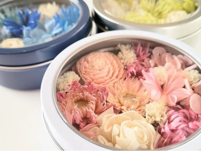 かわいいまん丸のマグネット缶に様々なドライフラワーを使ってフラワーアレンジメントを製作できます。