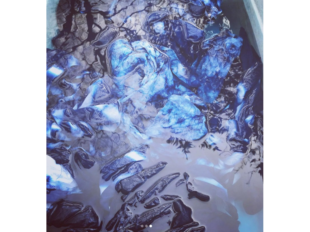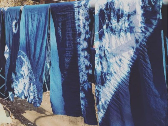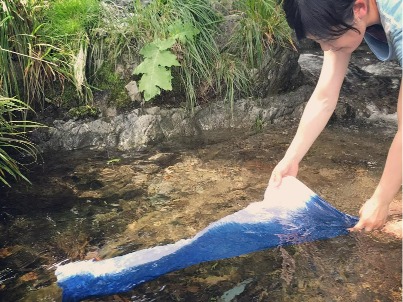 藍の染料液に、型をつけた素材を入れて染めていきます。最後は、集落の小川で染めた素材を洗います。