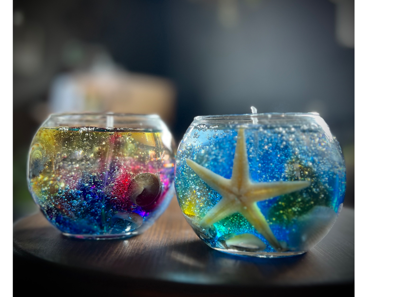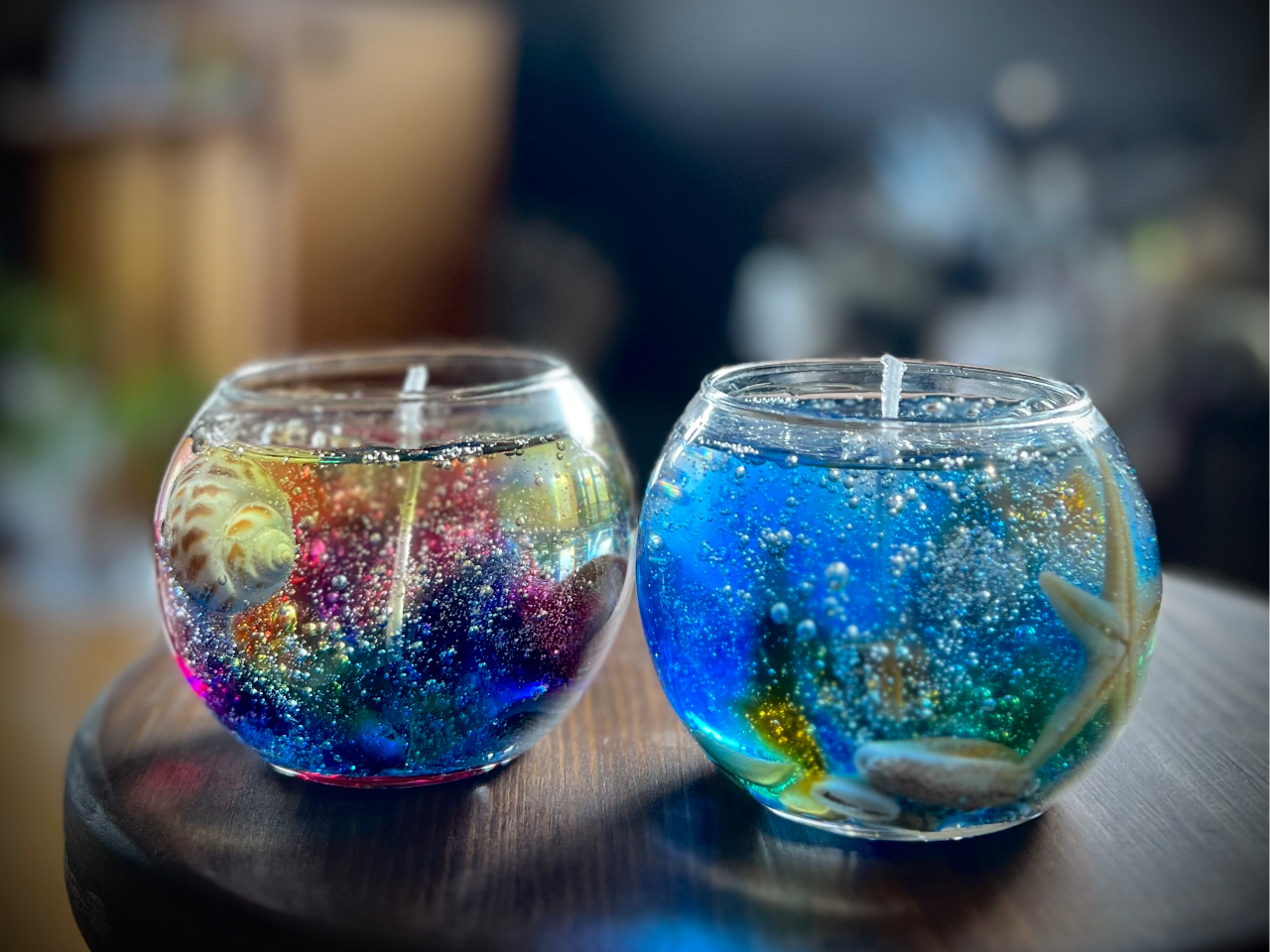 涼しげのカラージェルと貝殻パーツを選んでオリジナルのアロマジェルキャンドルが作れます。気泡が幻想的に灯すとキラキラでとても綺麗です。