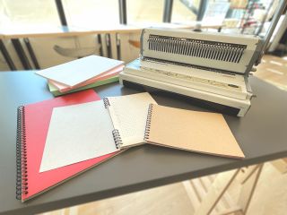 その後、半分に裁断して、紙に穴を開けて、リングを差し込み、機械で閉じて完成です。