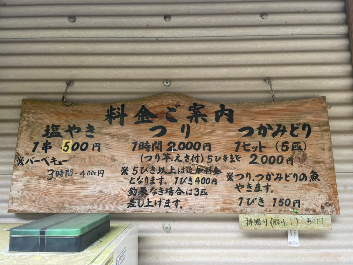 | 料金に含まれるもの | 釣り竿1本+餌:3000円※4匹まで※ 釣れなかった場合は3匹の保証付 5匹以上釣れた場合は、1匹500円の追加料金 釣ったヤマメを塩焼きされる場合は1匹あたり150円の追加料金 |