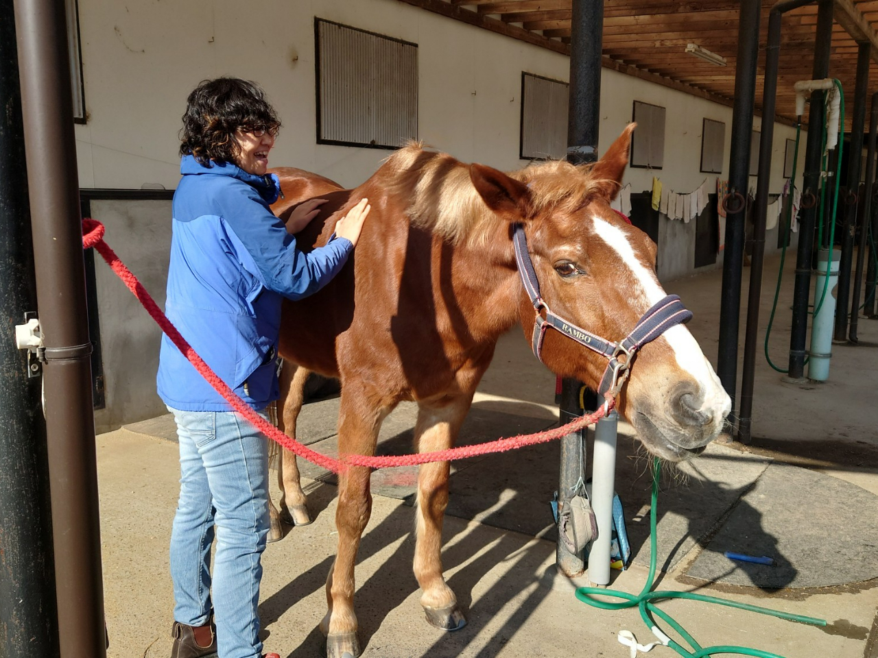 馬房掃除、馬のお手入れ、騎乗体験(10から15分)、厩舎の掃除をやります。