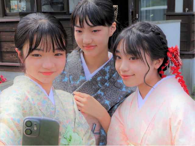 たくみの里の町並みにあった可愛いレトロ着物で