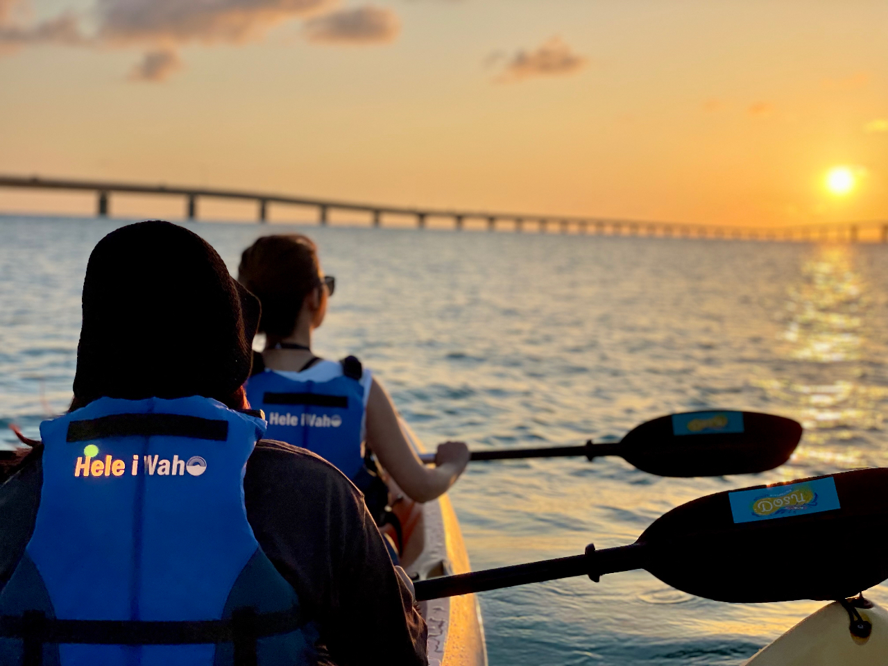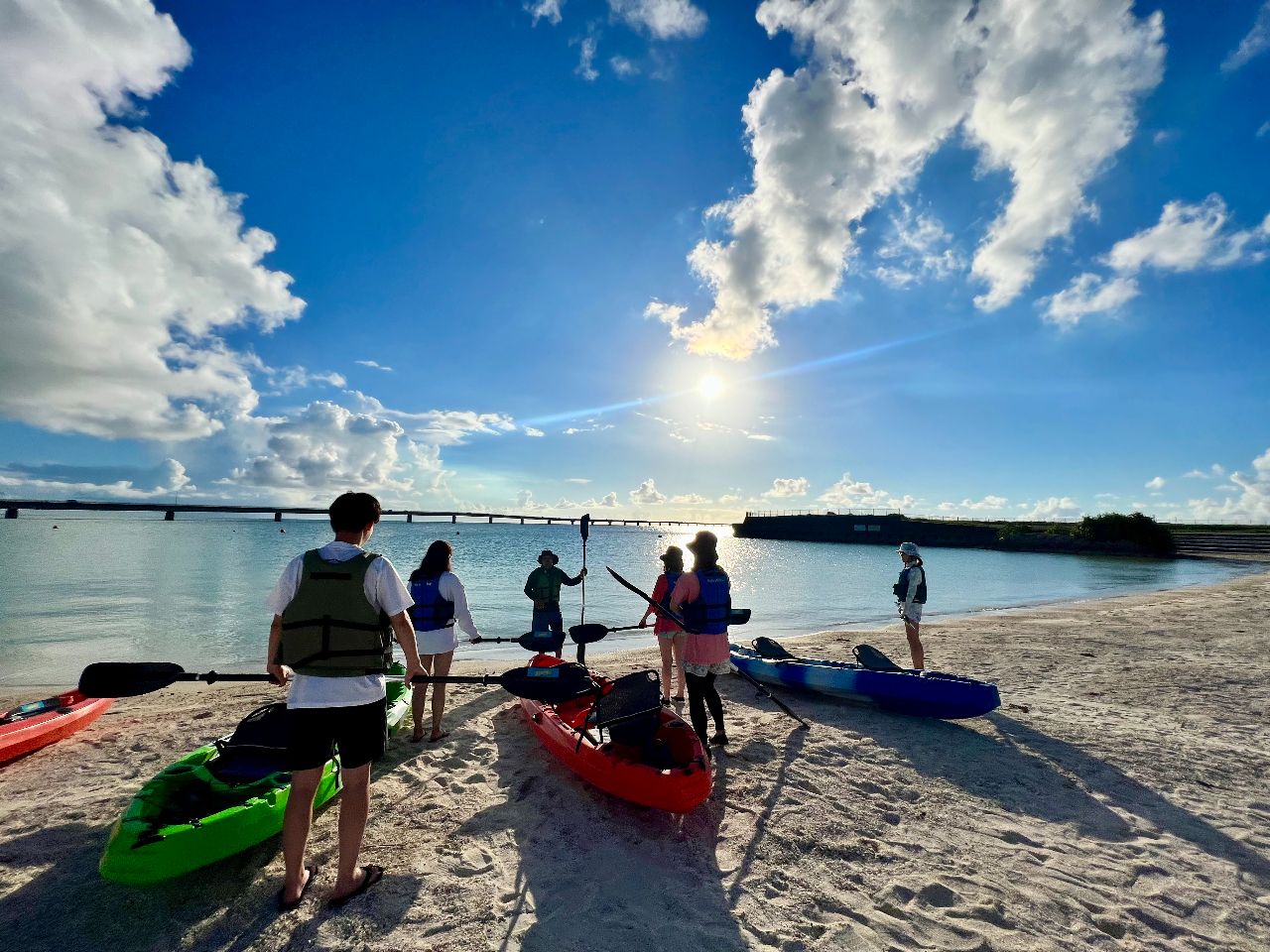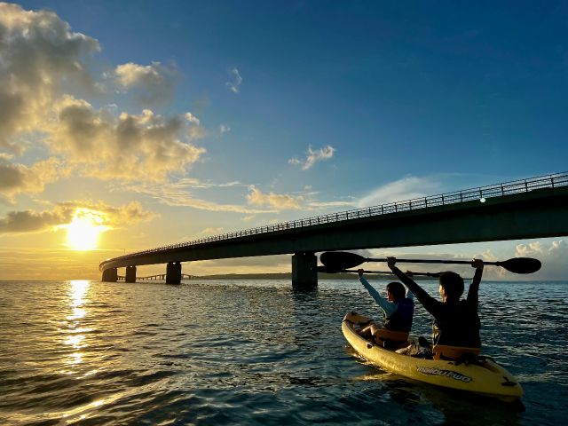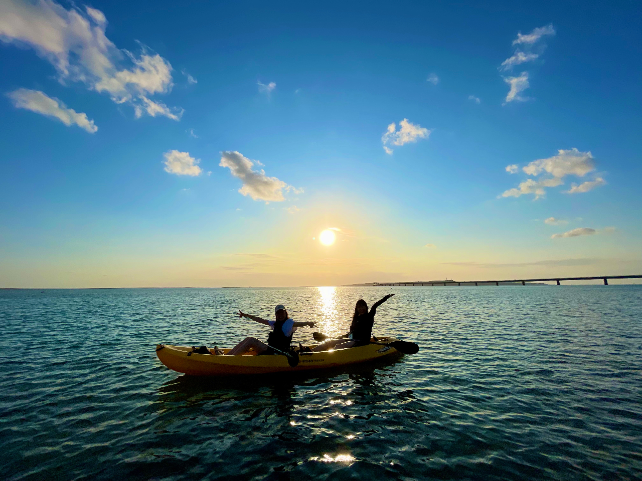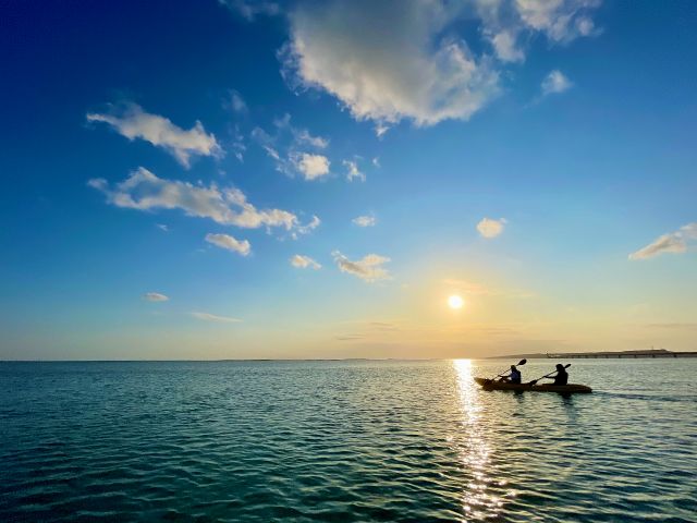 日々の疲れを癒す宮古島の青い海、水平線を見ながら綺麗な夕陽を眺めるシーカヤックツアー