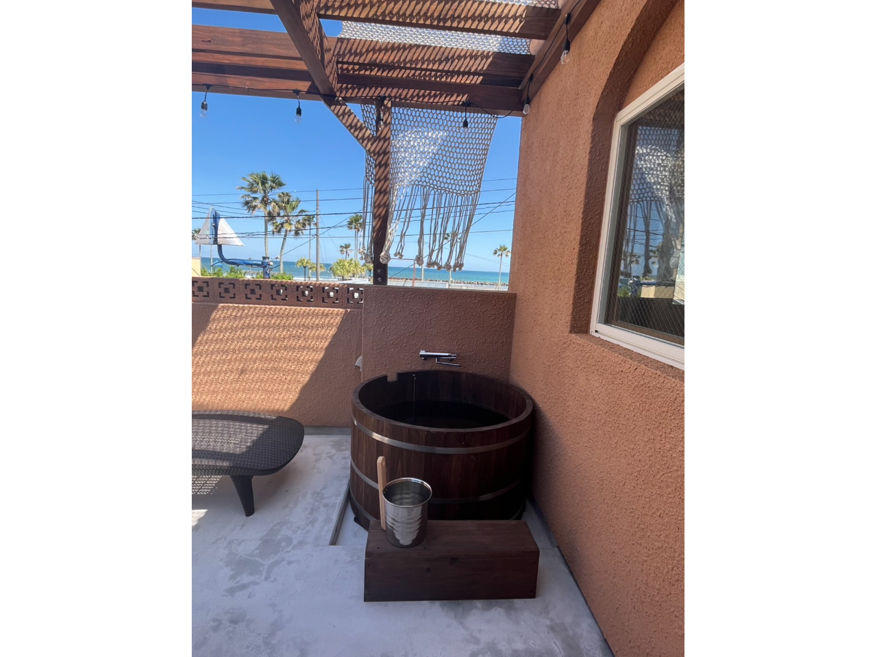 • テラスにはヒノキの水風呂を設置しました。もし事前にご希望があれば お湯をはっておくこともできます。