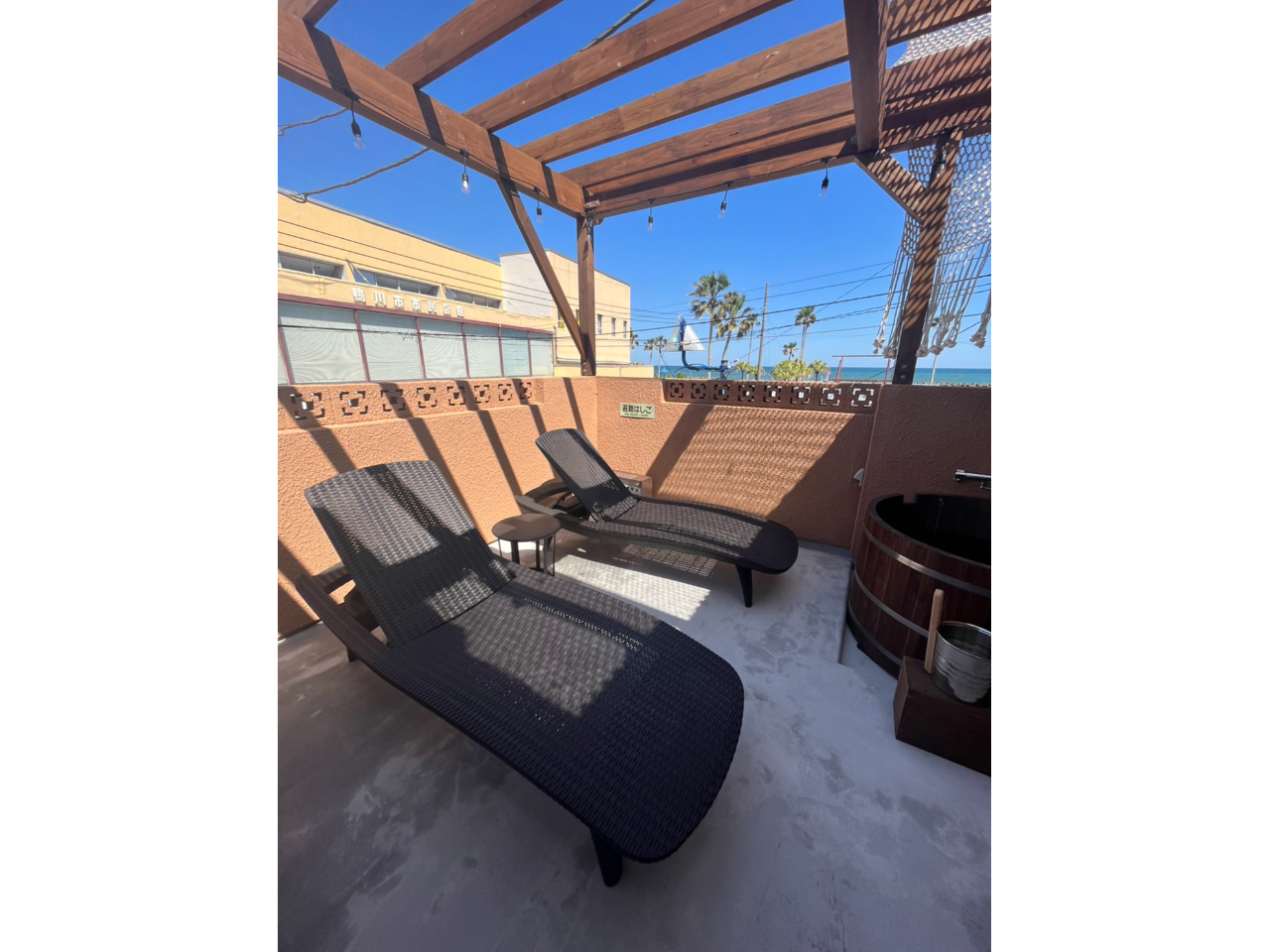 海を見渡せるテラスで外気浴を楽しんでいただくことができます。フルフラットになるラウンジャーで無料の例倉庫の中のソフトドリンクやスナックとともおくつろぎください。