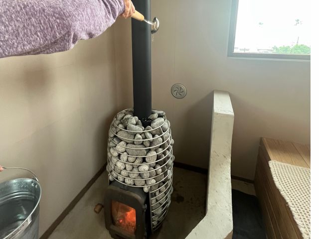 薪ストーブのサウナ室 壁面にはフィンランドから輸入したサーモウッドが使われています。1グループ様に2回のロウリュウとアウフグースを行い その後はセルフロウリュ可