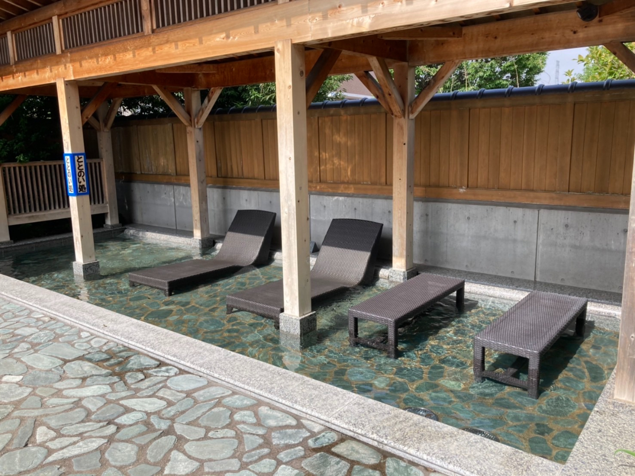 広々露天風呂は開放感抜群です。外気浴のイスもたくさんあります。