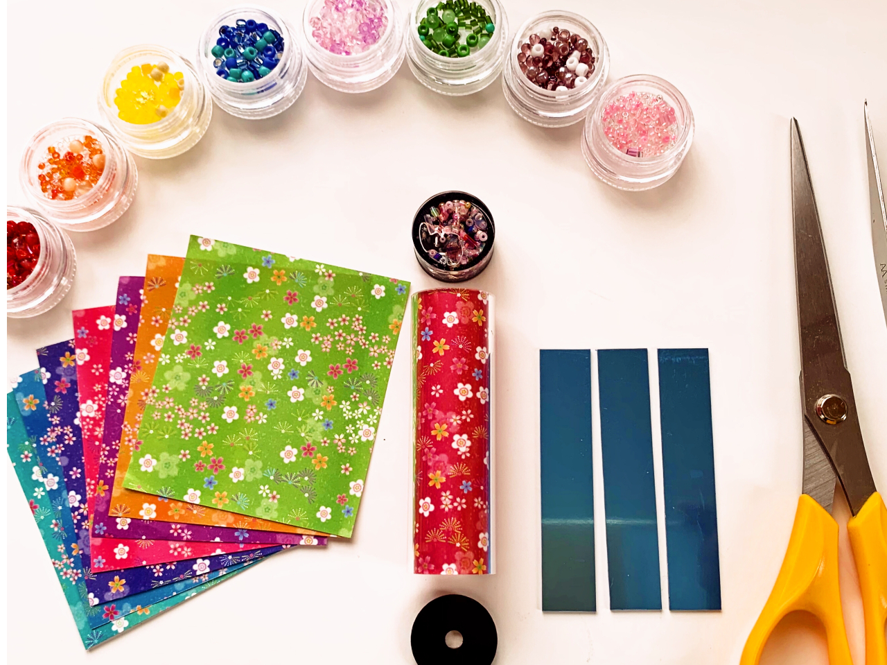 中に入れるのはカラフルなビーズやキラキラなパーツが主です。筒の模様は、和紙や可愛いペーパーなどです。こちらも沢山の中から選べます。