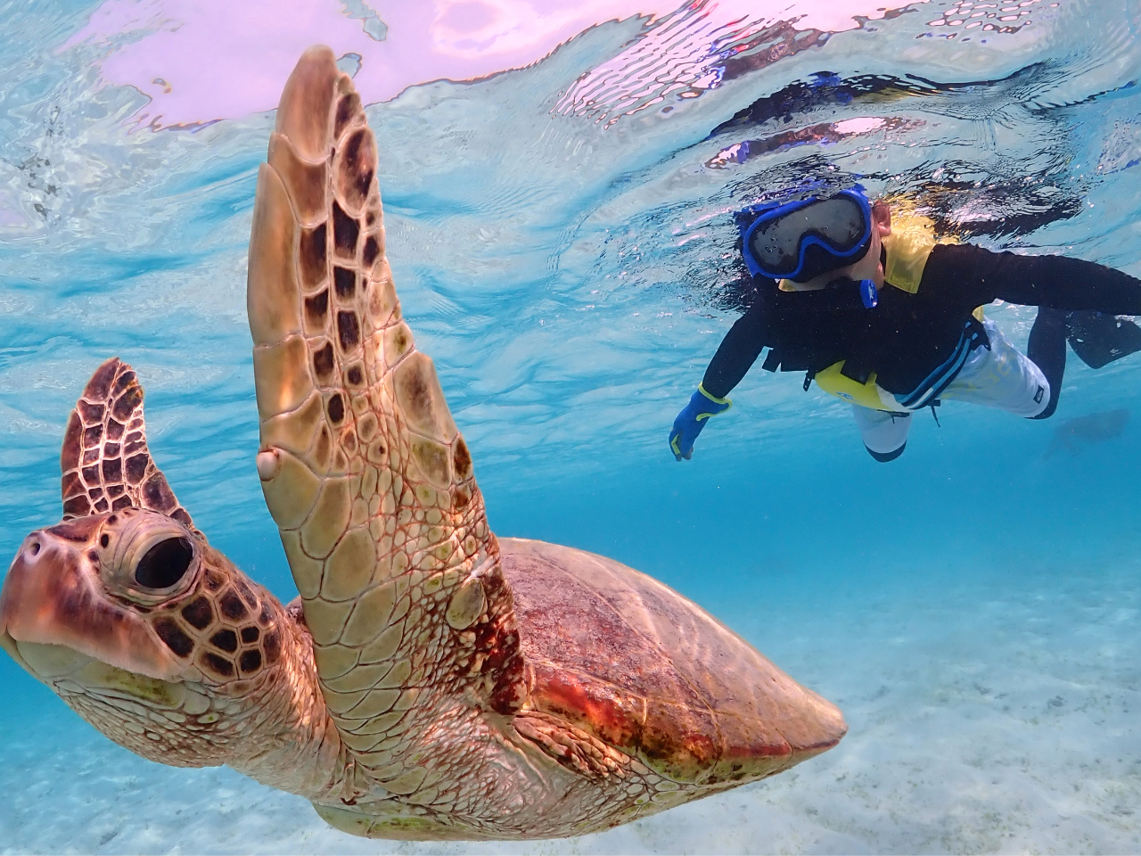 シュノーケルのプロが、皆様を安全にウミガメとお会いできるようガイドさせていただきます^^