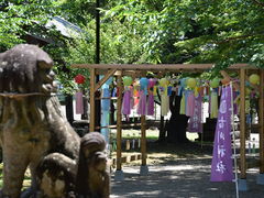 棚に風鈴と、てるてる坊主が飾ってありとても良い感じで境内も綺麗にされてまさす。梅雨の晴れ間に参拝させたいただきました。