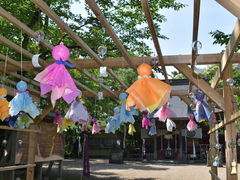棚に風鈴と、てるてる坊主が飾ってありとても良い感じで境内も綺麗にされてまさす。梅雨の晴れ間に参拝させたいただきました。