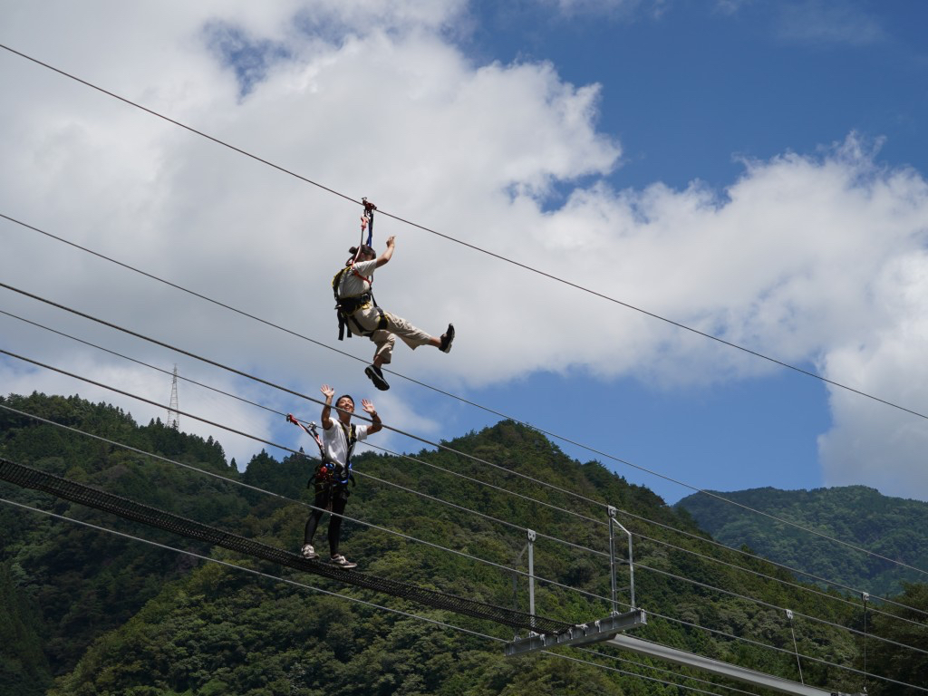 ・無事渡り切ったら、爽快なジップラインで駆け抜けます!