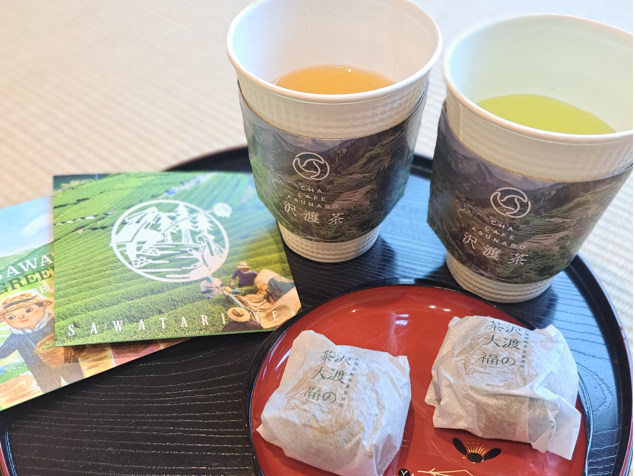 体験後は私たちが作っている「沢渡茶」を飲んで一息。茶請けに「沢渡の茶大福」もどうぞ。お土産に沢渡茶のティーバッグをプレゼントしております!!