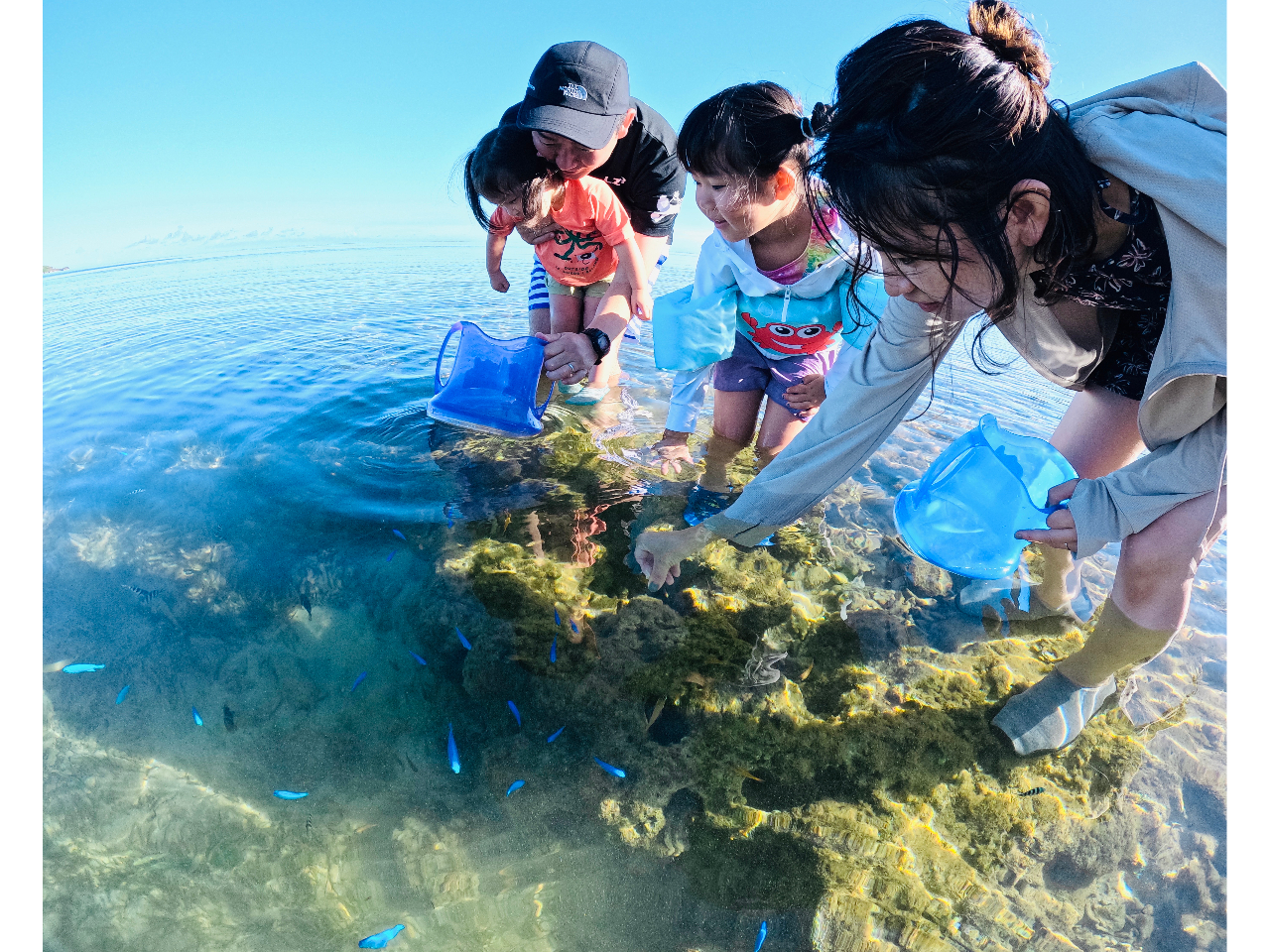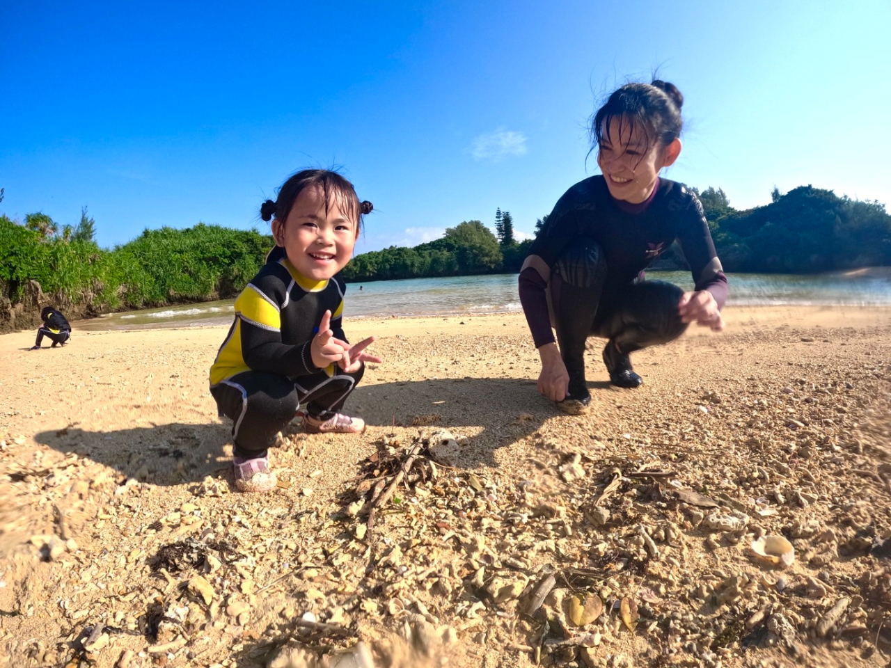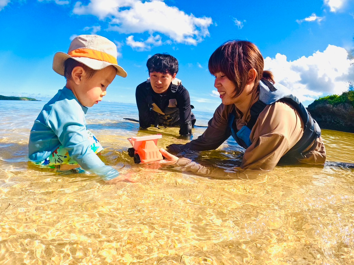 大人の遊びに子供が付き添うのではなく、あくまで【お子様が主役】。1歳から5歳までの小さなお子様の「やってみたい!」という気持ちに120%寄り添い、その場で遊び方を柔軟に決めていく完全オーダーメイド型の体験ツアーです。砂浜でのんびり砂遊びをしたり、磯でカニやヤドカリを探したり、ちょっと勇気を出して足をチャプチャプ水遊びしたり。慣れてきたらマスクをつけて魚をのぞくシュノーケルにも挑戦できます。
