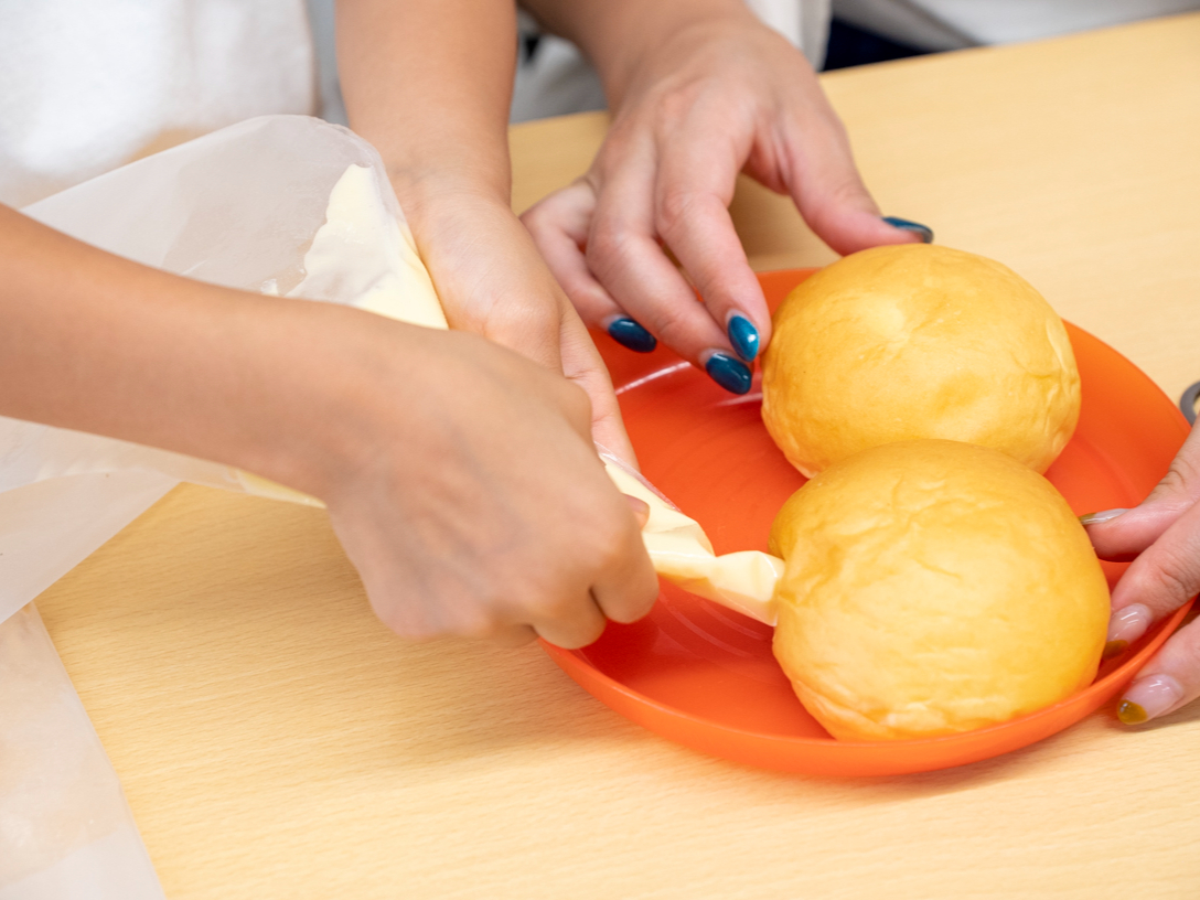 パンを焼いている間にクリームの注入体験をしていただきます。