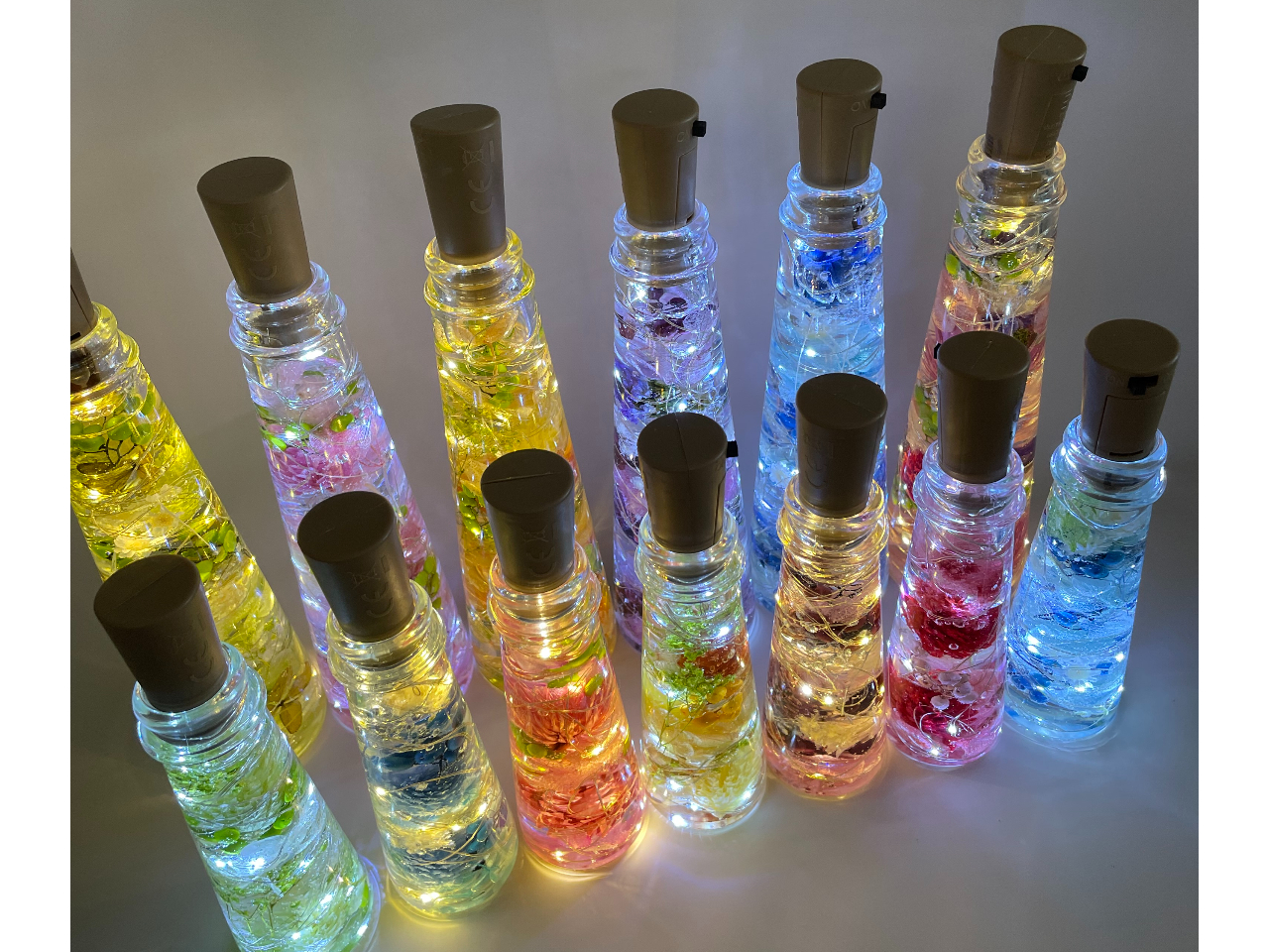 ハーバリウムの中にLEDライトを入れキラキラ光るハーバリウムを製作。
