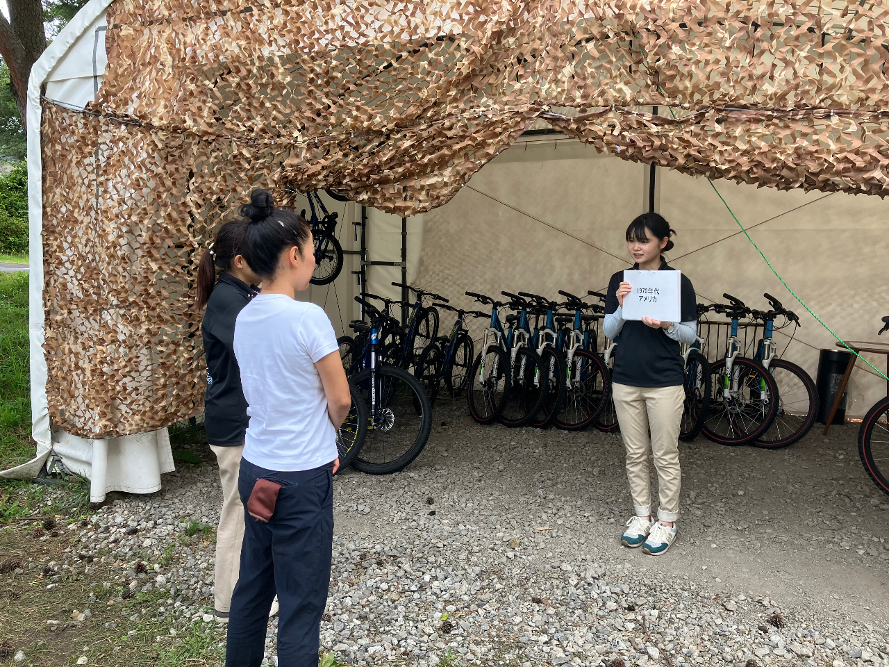 参加者は全員ヘルメットを装着し、インストラクターがしっかりマウンテンバイク(MTB)の取り扱い方、操作方法などのインストラクションを行います。