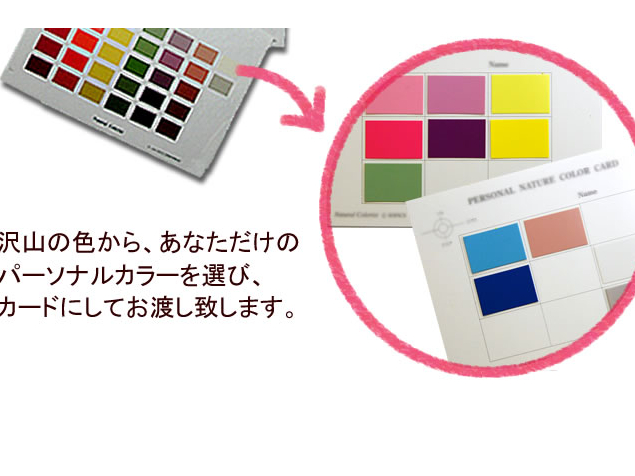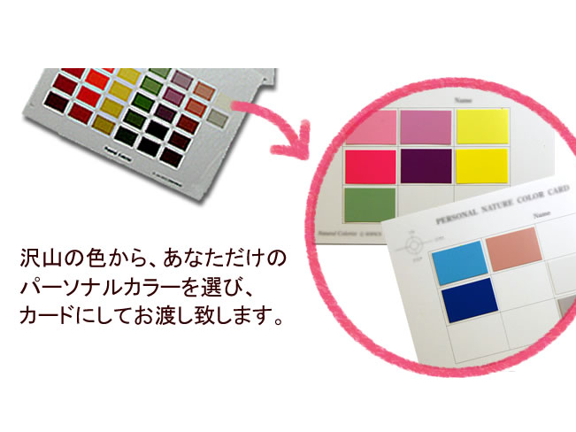 パーソナルネイチャーカラーカードを作成いたします。今後の色選びにも活用できます