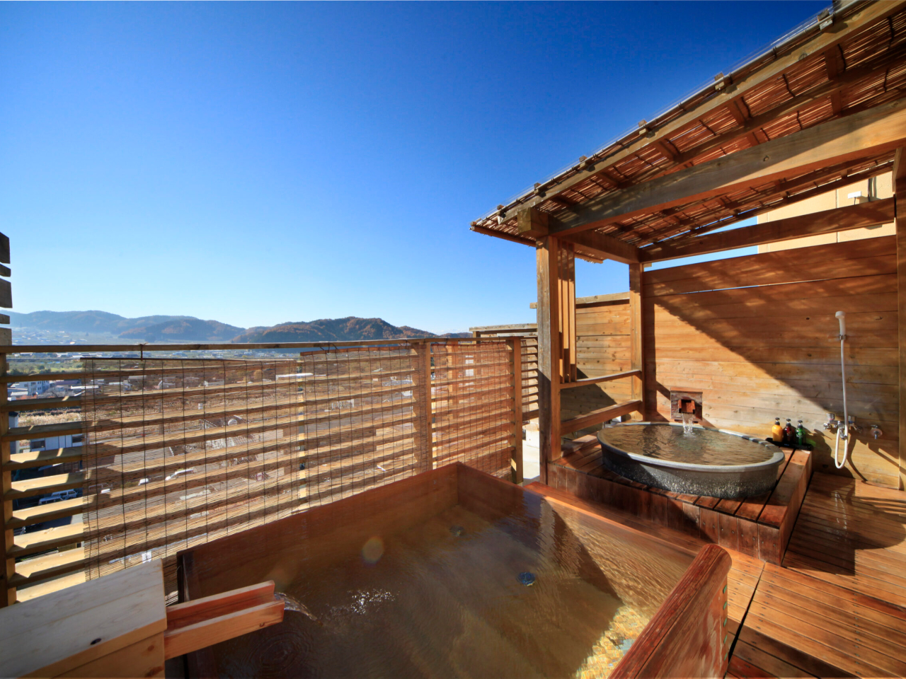 【貸切展望露天風呂 TSUBAKI】貸切露天風呂には陶器の浴槽と檜の2つの浴槽。 四季の風を感じながら、ゆったりとお過ごし頂けます。