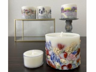 お好きなお花を選んでボタニカルキャンドル(Soy)をおひとつと、お好きな香りでティーライトキャンドルをおひとつ作成していただけます。