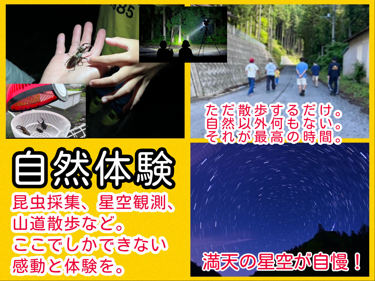 ■川遊び、昆虫採集、星空観測、ドラム缶風呂、囲炉裏体験可!