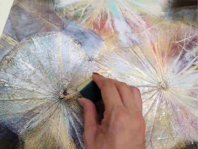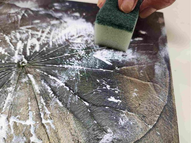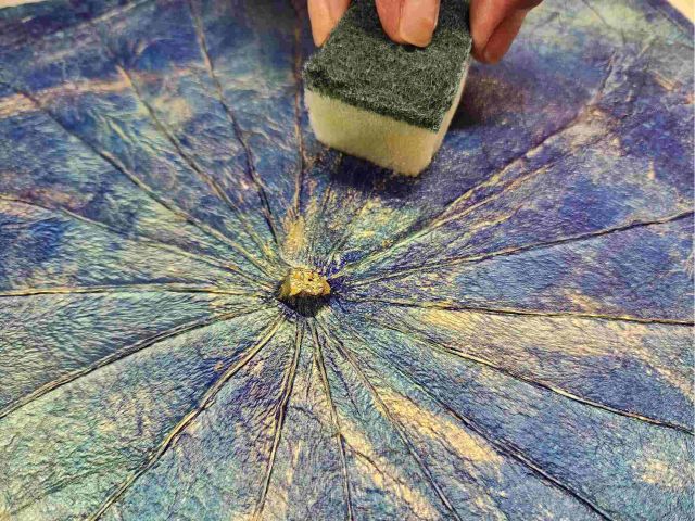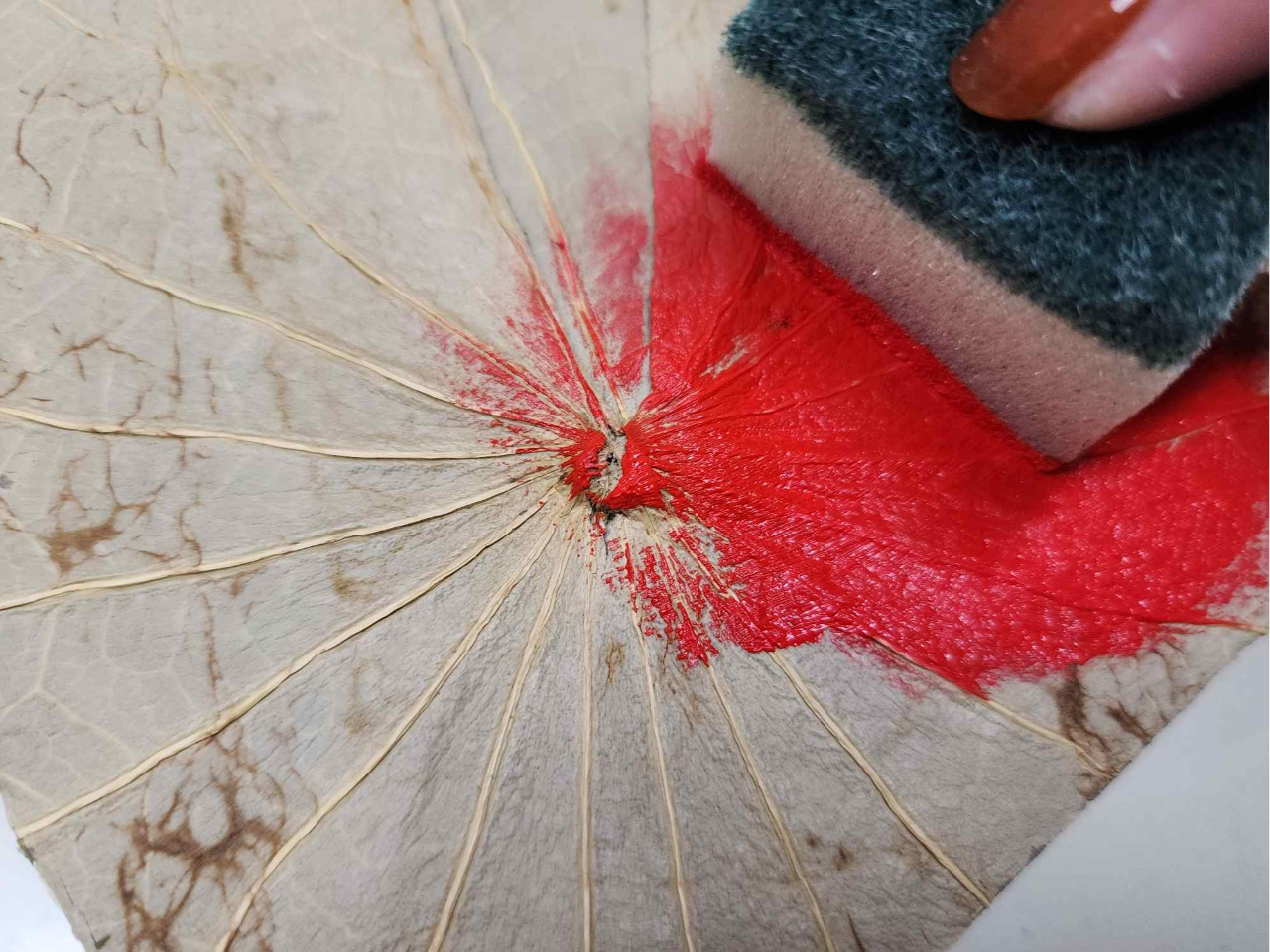 本物の蓮の葉やインド菩提樹をパネルに貼り付けて、彩色するアートです。