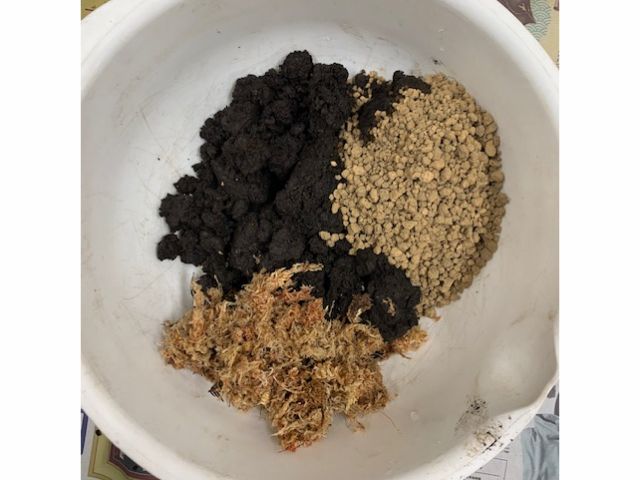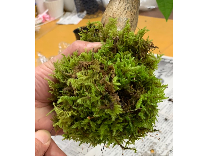 苔玉用の土を平らにして植物の根の部分を包み込み、丸く形を整えます。