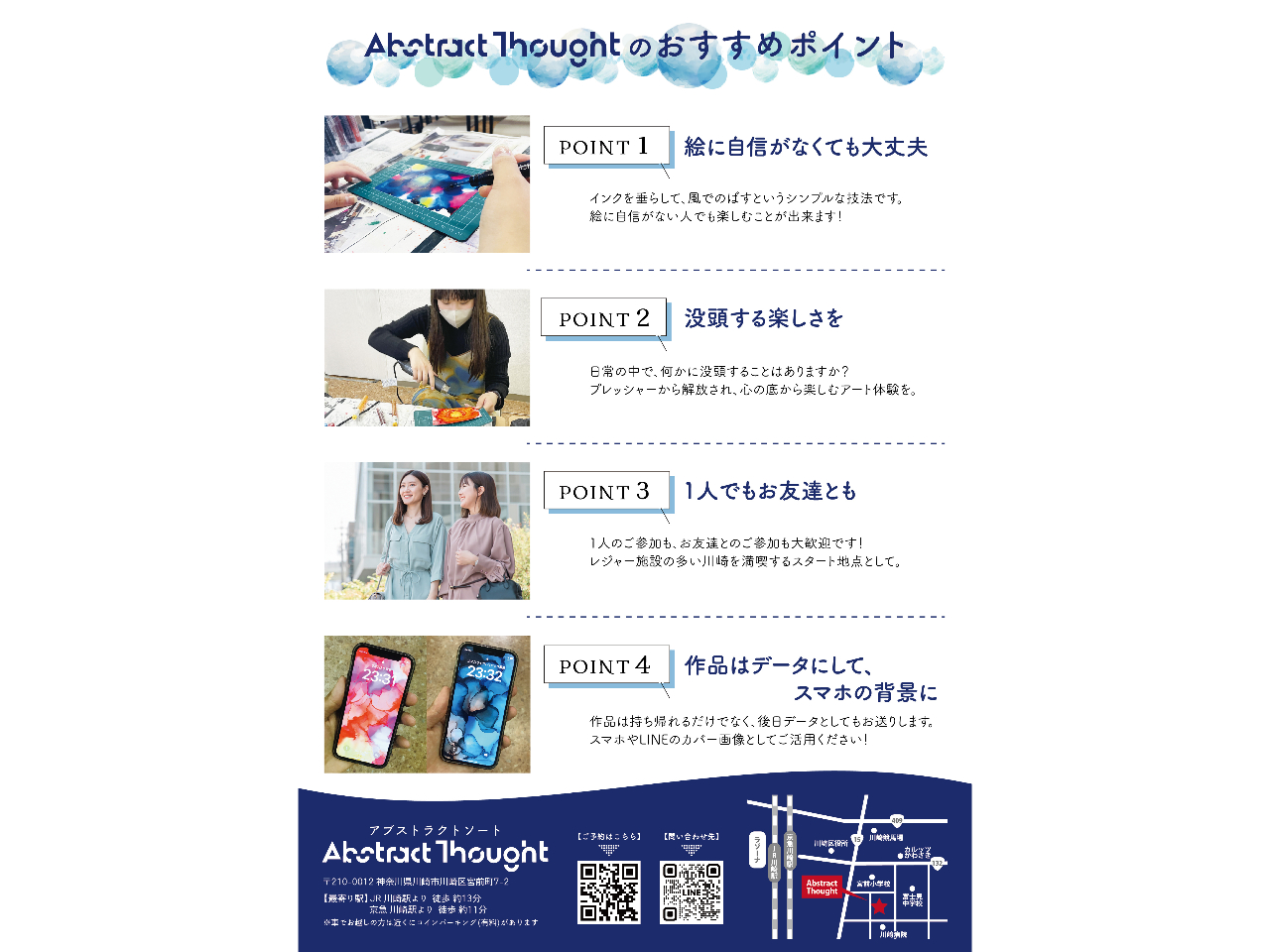 | 体験場所 | 〒210-0012 神奈川県川崎市川崎区宮前町7-2-101 Abstract Thought(アブストラクトソート)  |