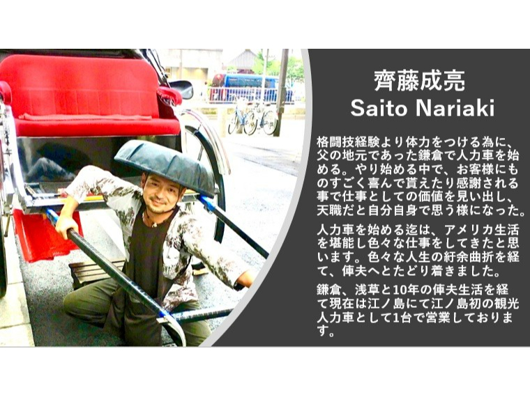 ・鎌倉や浅草で10年以上の観光人力車キャリアと江ノ島エリアで育ち、江ノ島藤沢ガイドクラブにも所属の地元俥夫が丁寧&おもしろくご案内!