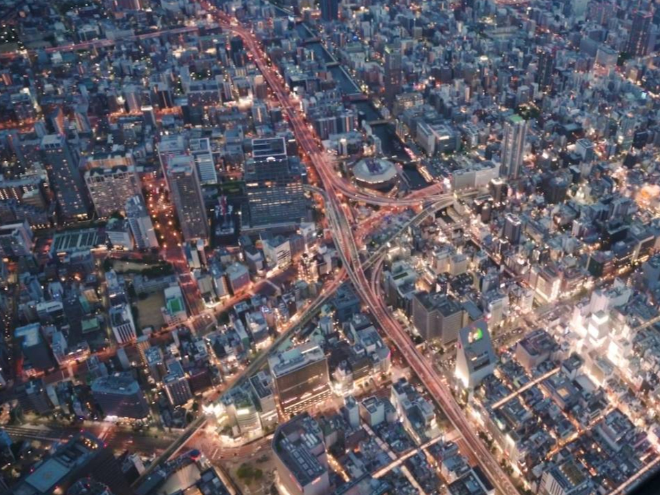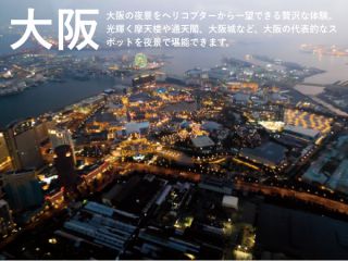 大阪の夜景をヘリコプターから一望できる贅沢な体験。光り輝く観覧車やビル群、通天閣のライトアップなど、ロマンチックで美しい景色が広がり特別な思い出になること間違いなし。