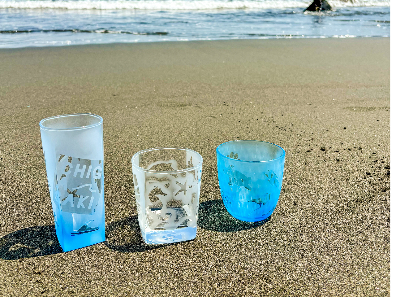 グラス サンドブラスト(砂を吹き付ける)でグラスに彫刻して模様を入れられます。 |