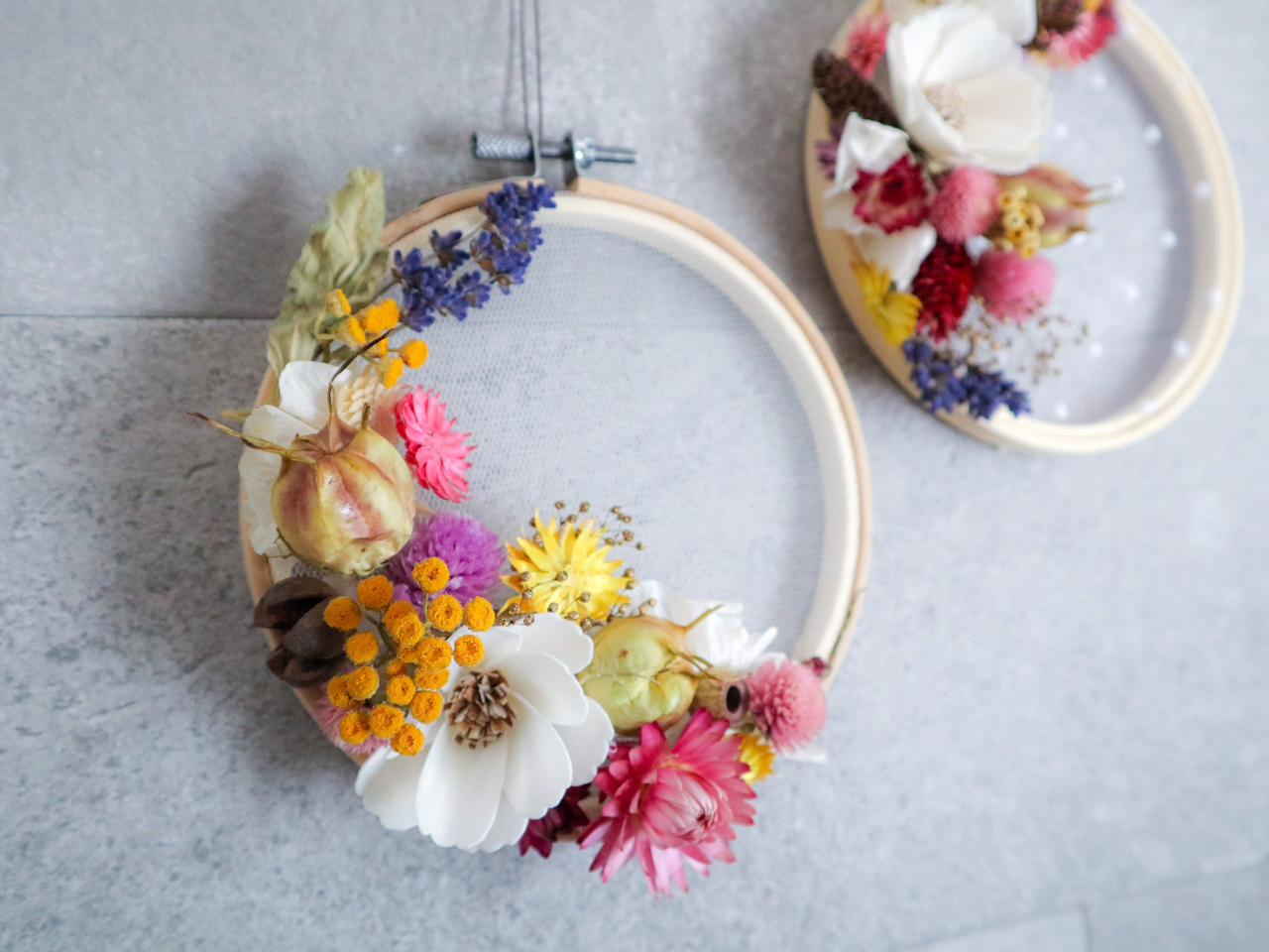 ドライフラワーやアーティフィシャルフラワーを使って刺繍枠にアレンジ体験*゜。