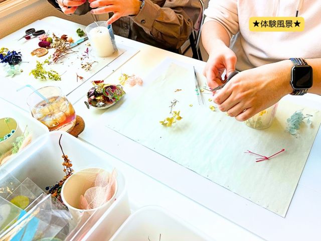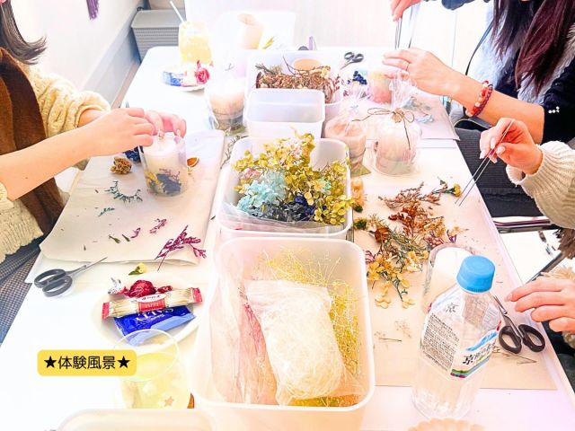 お花やアロマを使ったオリジナルキャンドルや、透明なジェルに着色したり小物やお花を入れて作るジェルキャンドル等、様々なタイプのキャンドルをお作り頂けます。