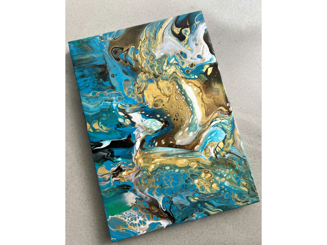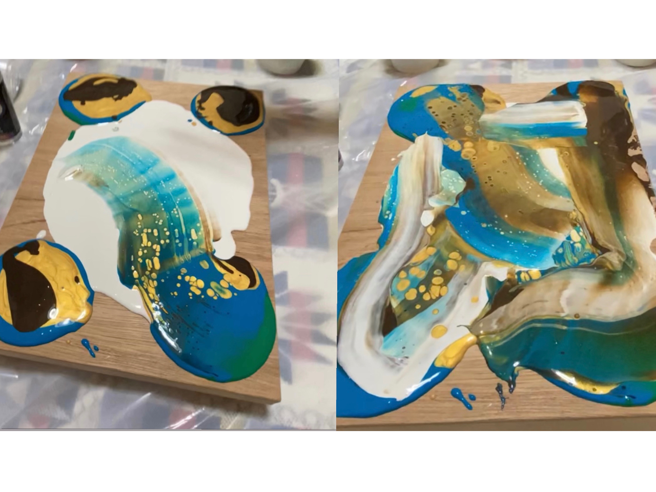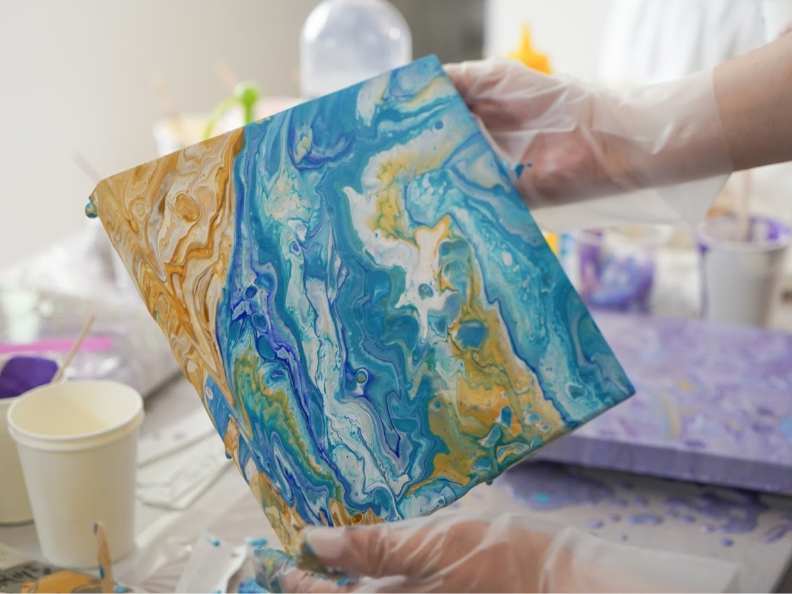 お好きな色を選んでいただき、絵の具を特別な画材と混ぜて液状化します。キャンバスの中でマーブリングさせたり、オイルを使い色を分離させて美しい模様を作っていきます。