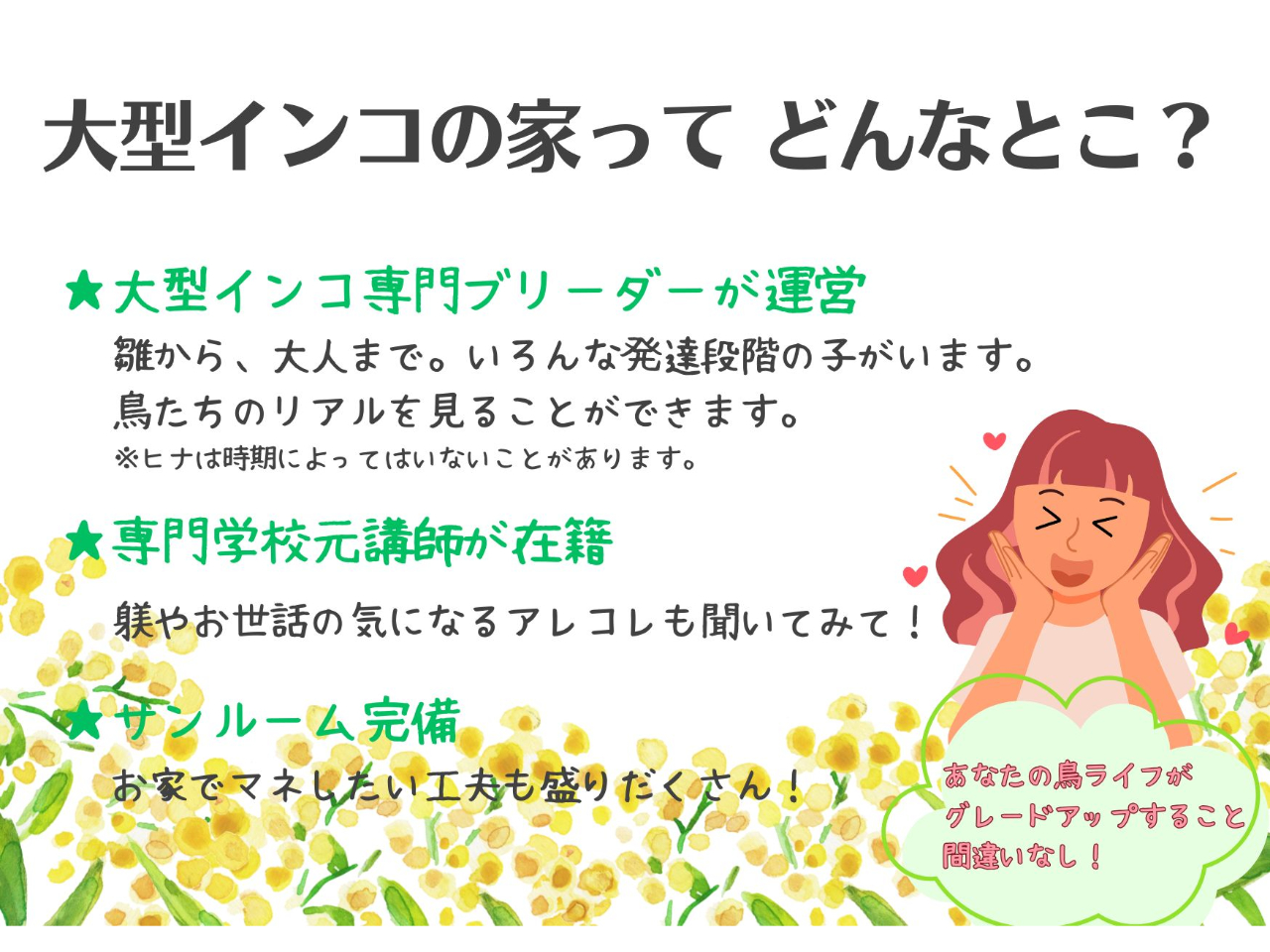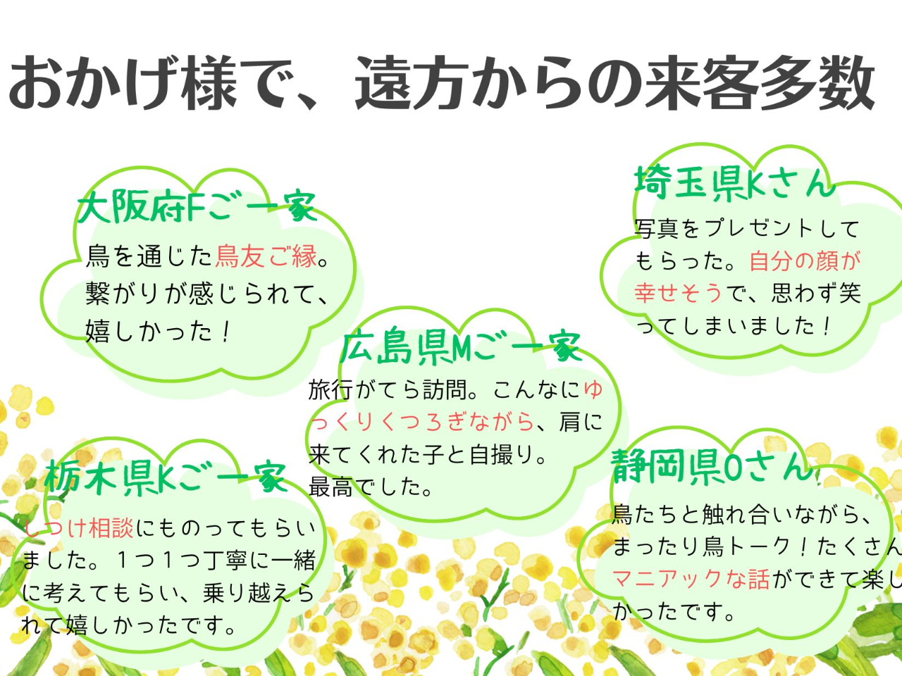 ・スタッフやインコの写真(一部を除き)は、断りなくSNSなどに掲載いただいて構いません(商用利用も可)。