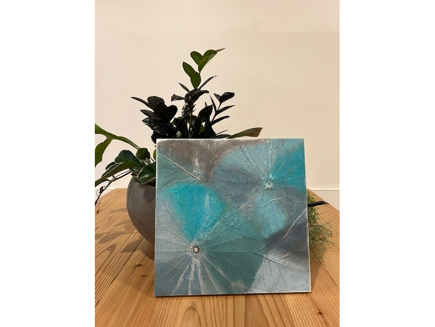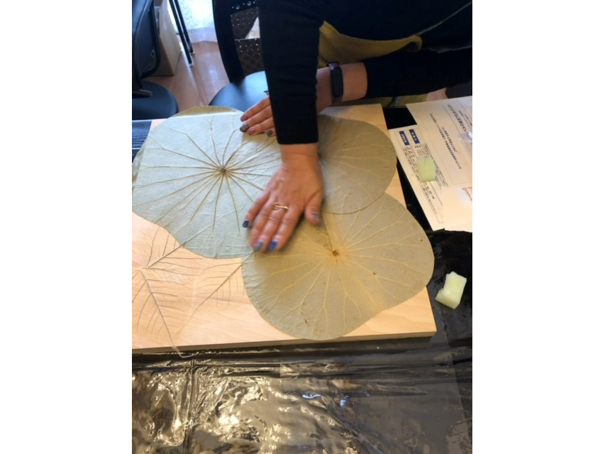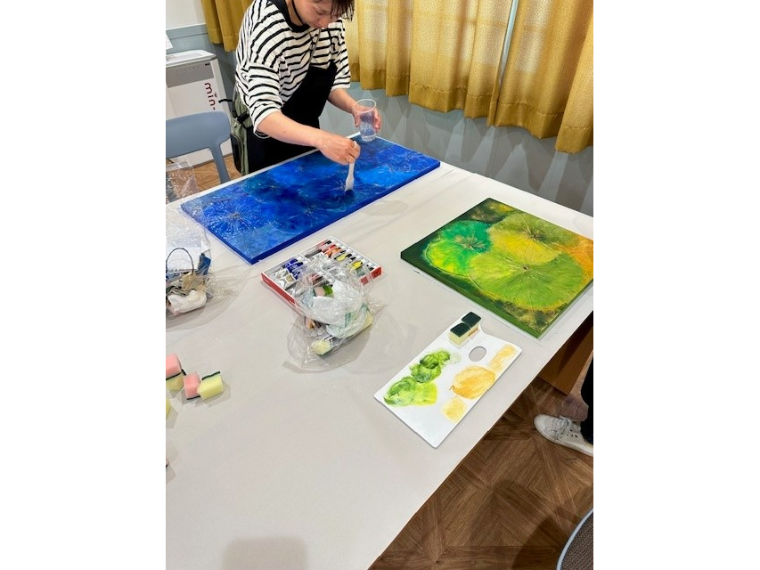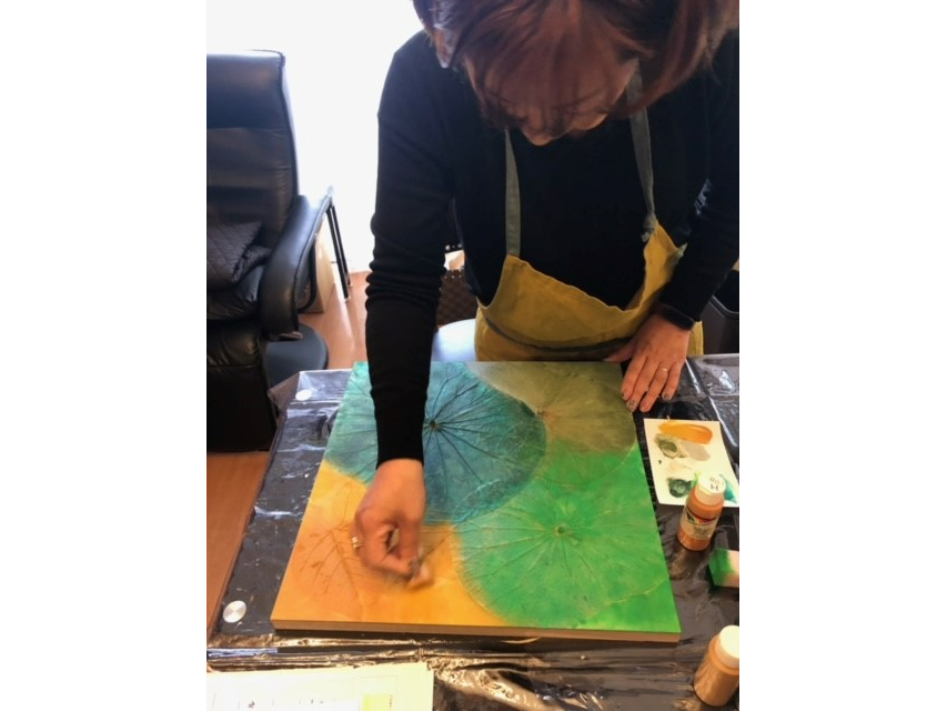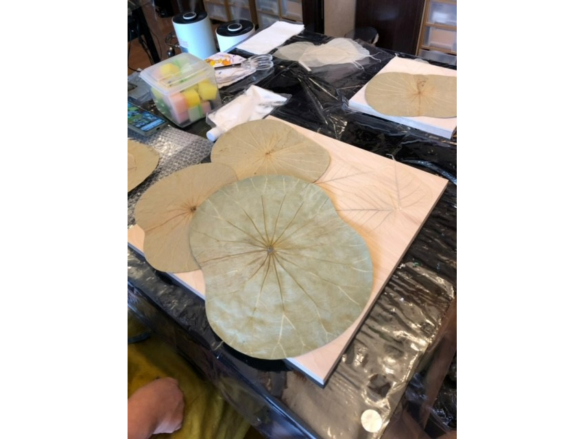 本物の蓮の葉をパネルに貼りつけて彩色するアート講座です♪