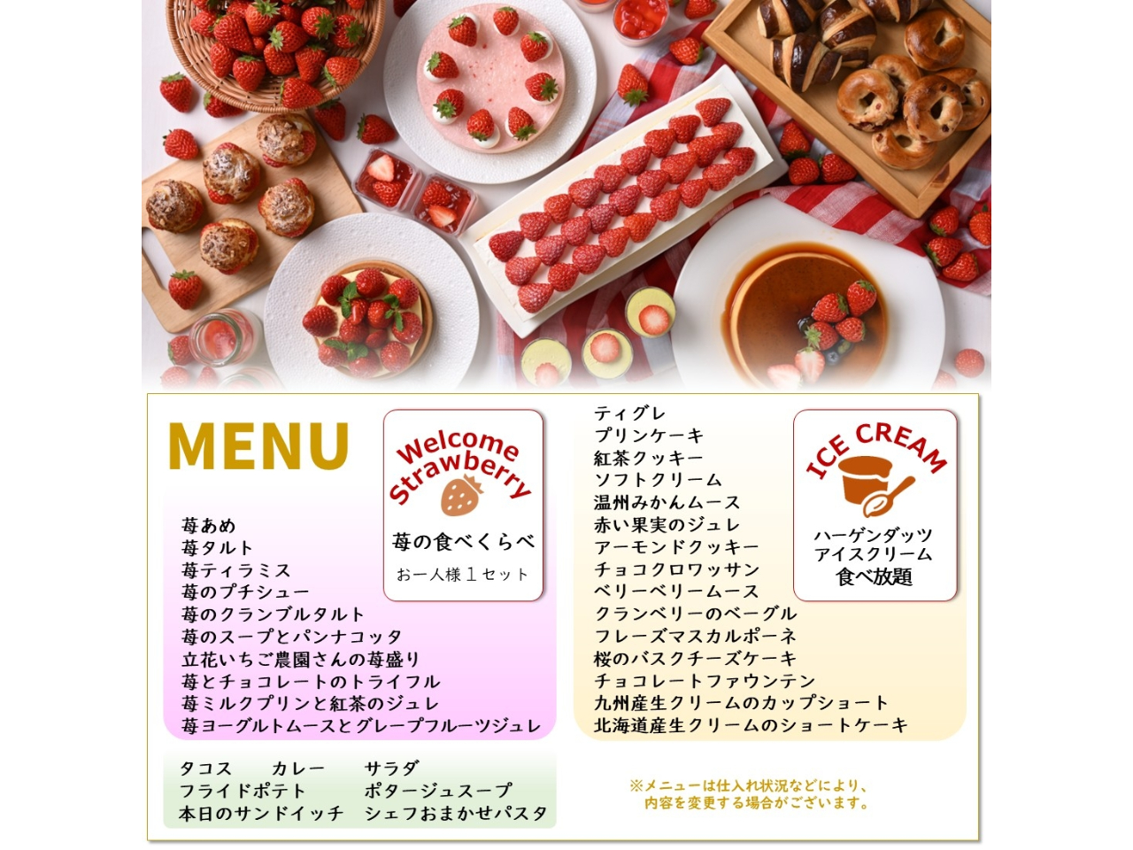 ≪期間限定開催≫【春のいちごスイーツビュッフェ Strawberry Dining ーいちごの森ー】特製スイーツや軽食など30種類以上!ハーゲンダッツアイスクリームも食べ放題♪