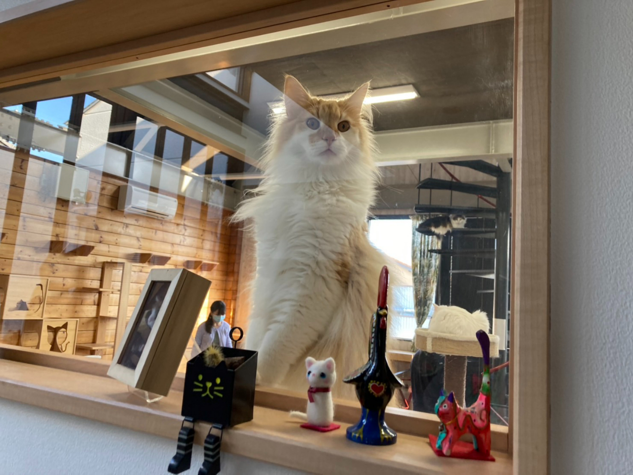 木のぬくもりが溢れる日当たりの良い吹き抜け空間で人懐っこい長毛猫さんがお出迎えいたします。