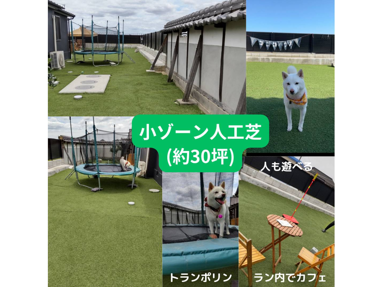 ドッグランは小ゾーンの人工芝エリア(約30坪)と大ゾーンのグランドエリア(約130坪)があります。人工芝のドッグラン内には、ワンちゃんにも大人気の「トランポリン」を設置。気に入ってくれたワンちゃんは自ら飛び乗りゴロゴロと楽しんでいますよ。その他にもワンちゃんと人が一緒に遊べるようなボール、夏場は氷水やぴちゃぴちゃと水遊びができるようなちょっとした桶をご用意しています。