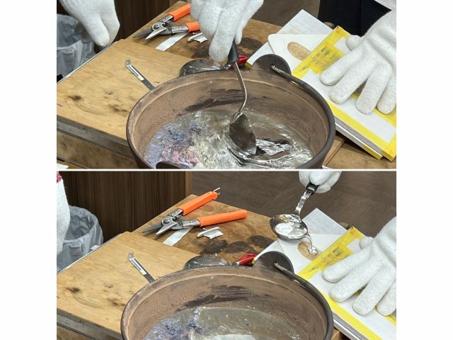 まずは、鉄鍋に溶けた錫を柄杓ですくってみましょう。